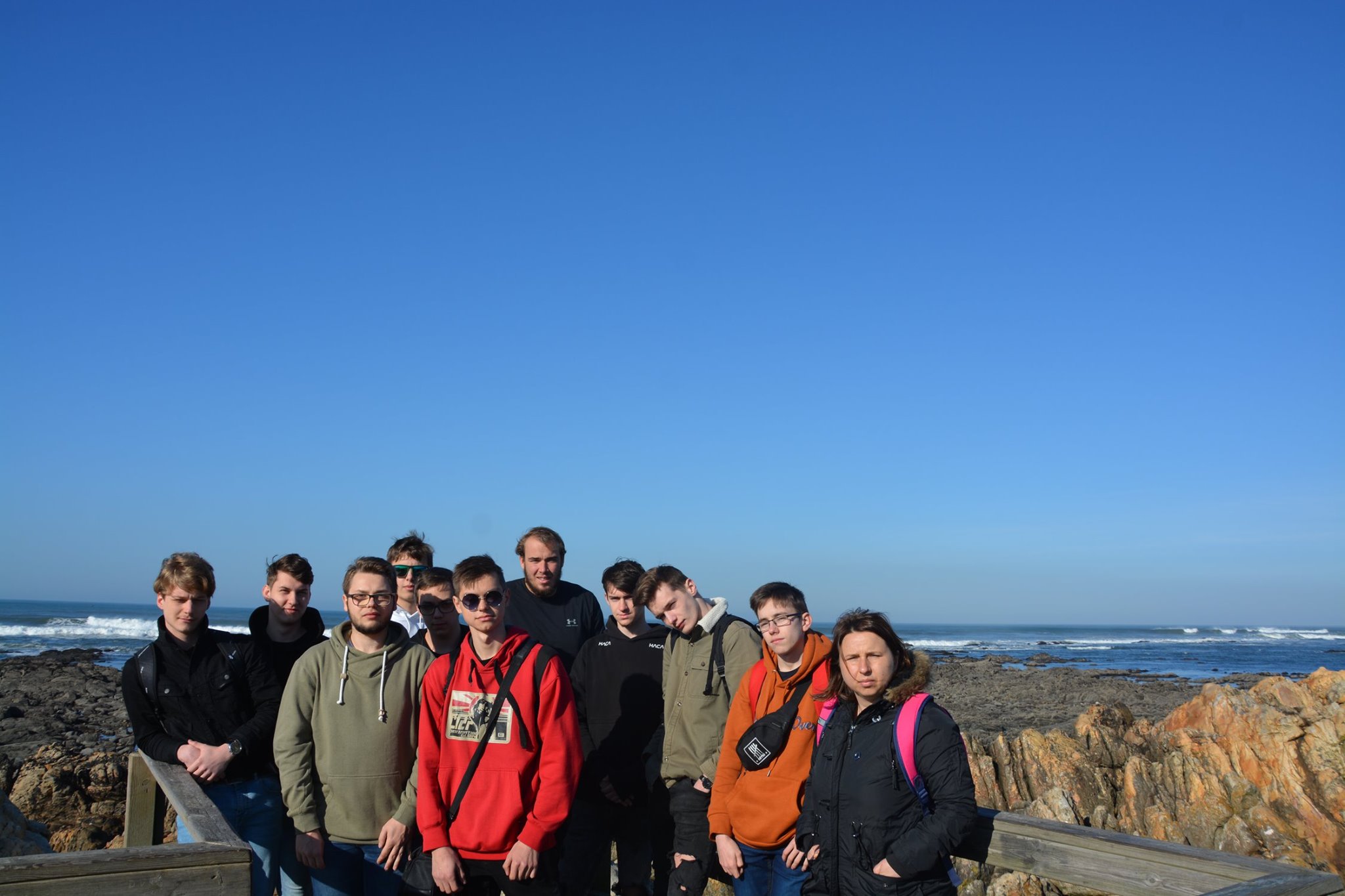 Uczniowie siedzący na murku, a za nimi ocean.