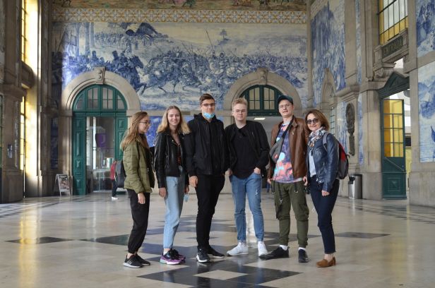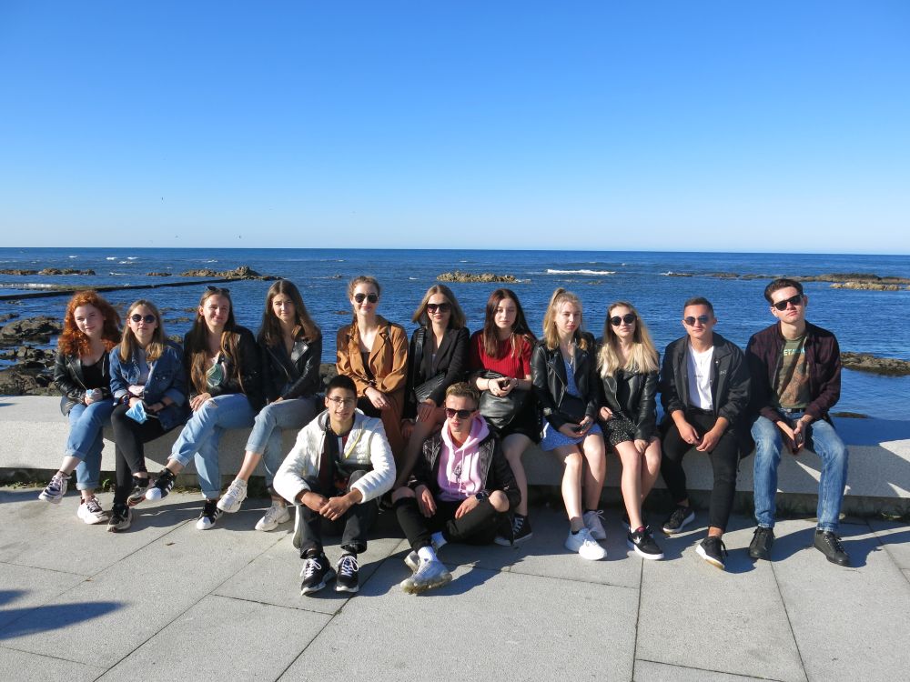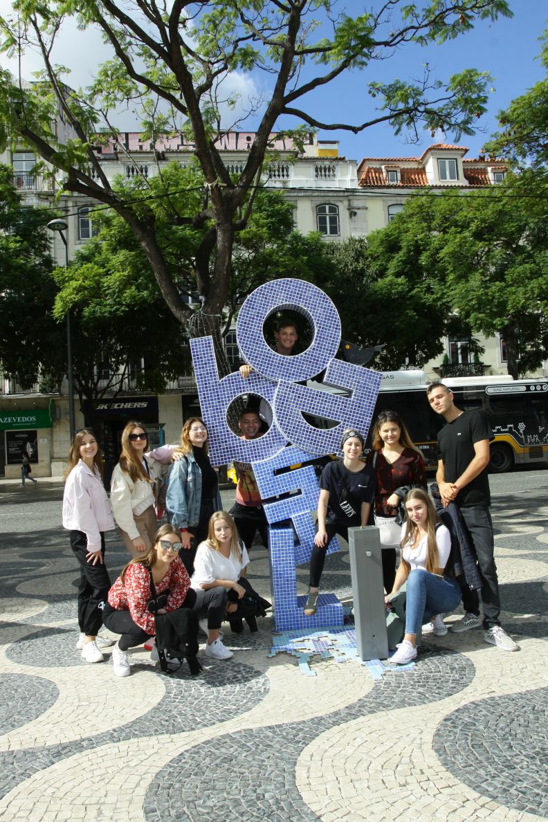 Uczniowie stojący obok pomnika w kształcie napisu Lisboe.