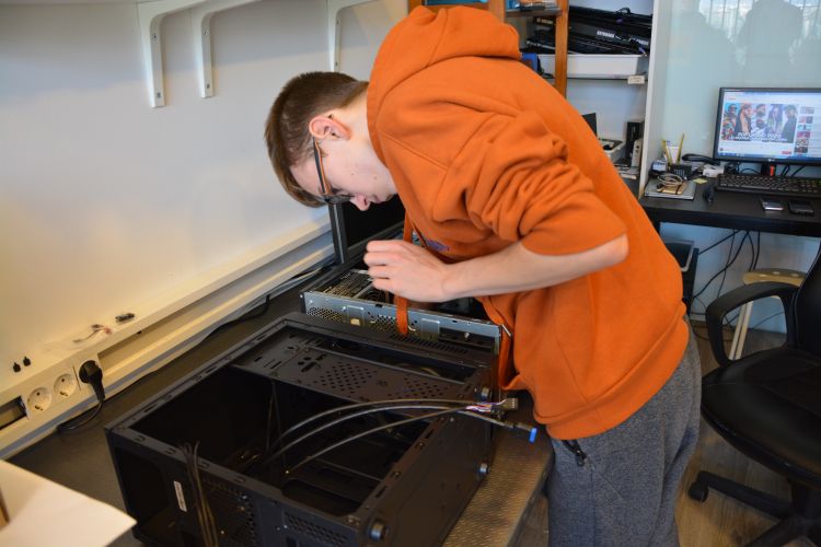 Uczeń podczas praktyk zawodowych, oglądający wnętrze komputera.