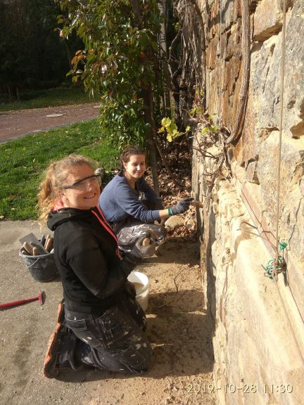 Uczennice podczas praktyk malujące ścianę budynku.