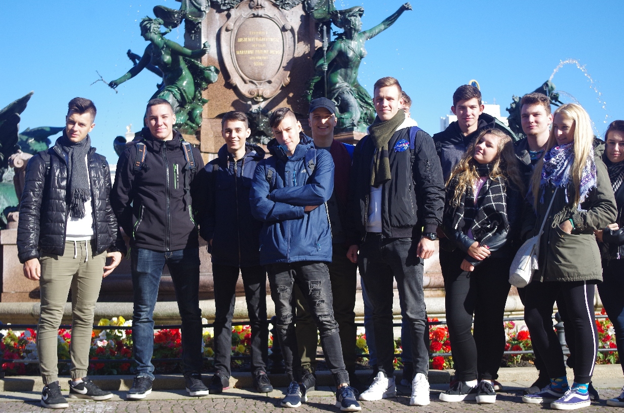Uczniowie stojący przed budynkiem hotelu.