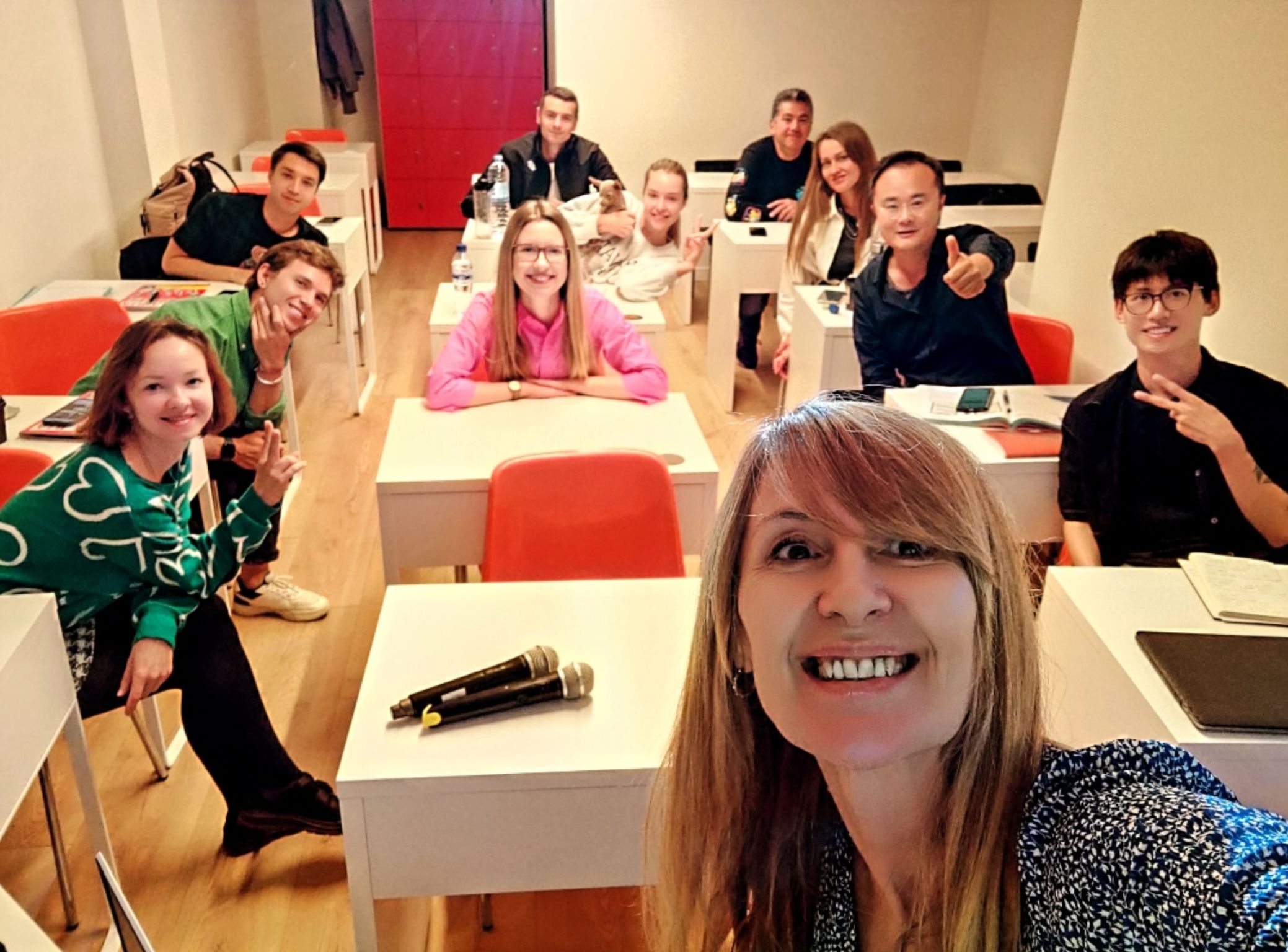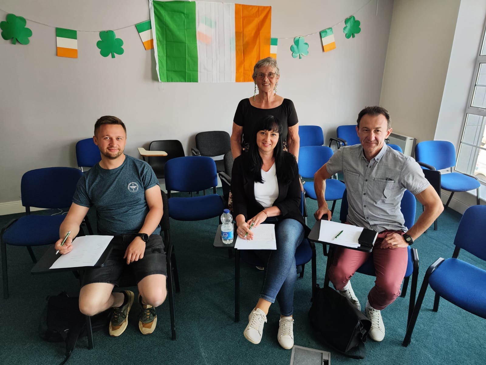 Uczestnicy kursu siedzący w ławkach, a przed nimi prowadzącą zajęcia.