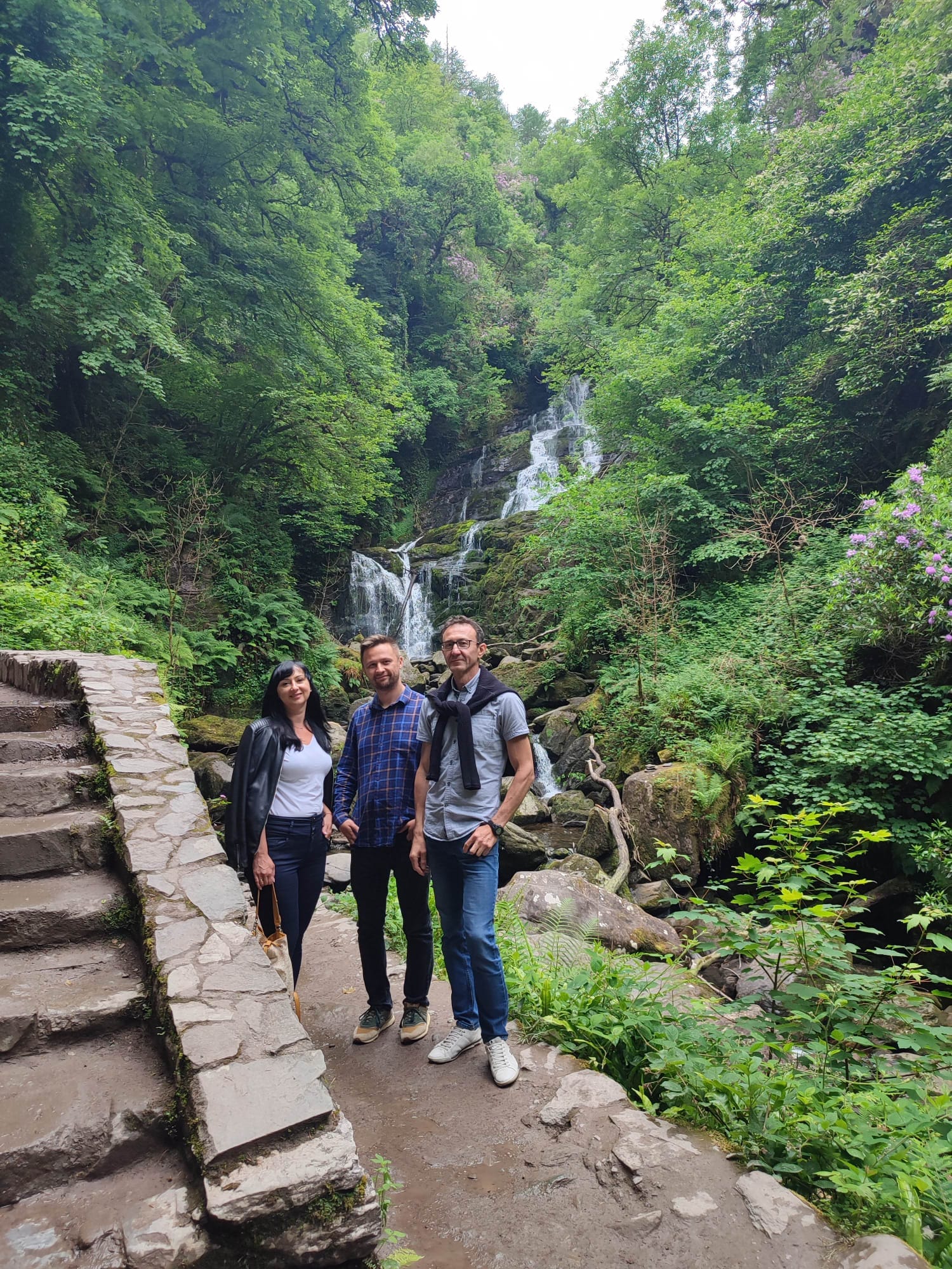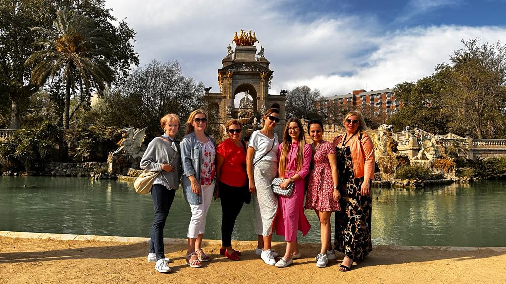 Nauczycielki stoją przed kaskadą w parku.