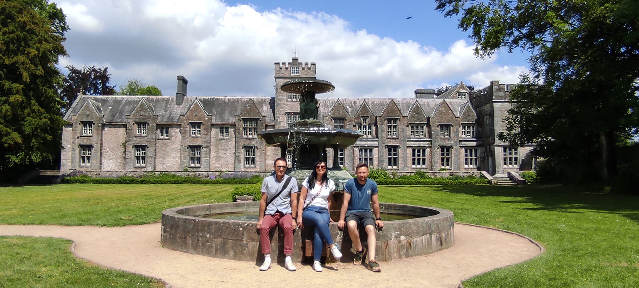 Nauczyciele siedzący na brzegu fontanny przed znajdującej się przed budynkiem.