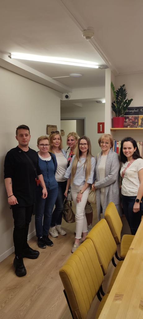 Nauczycielki stojące w sali wraz z prowadzącym zajęcia.
