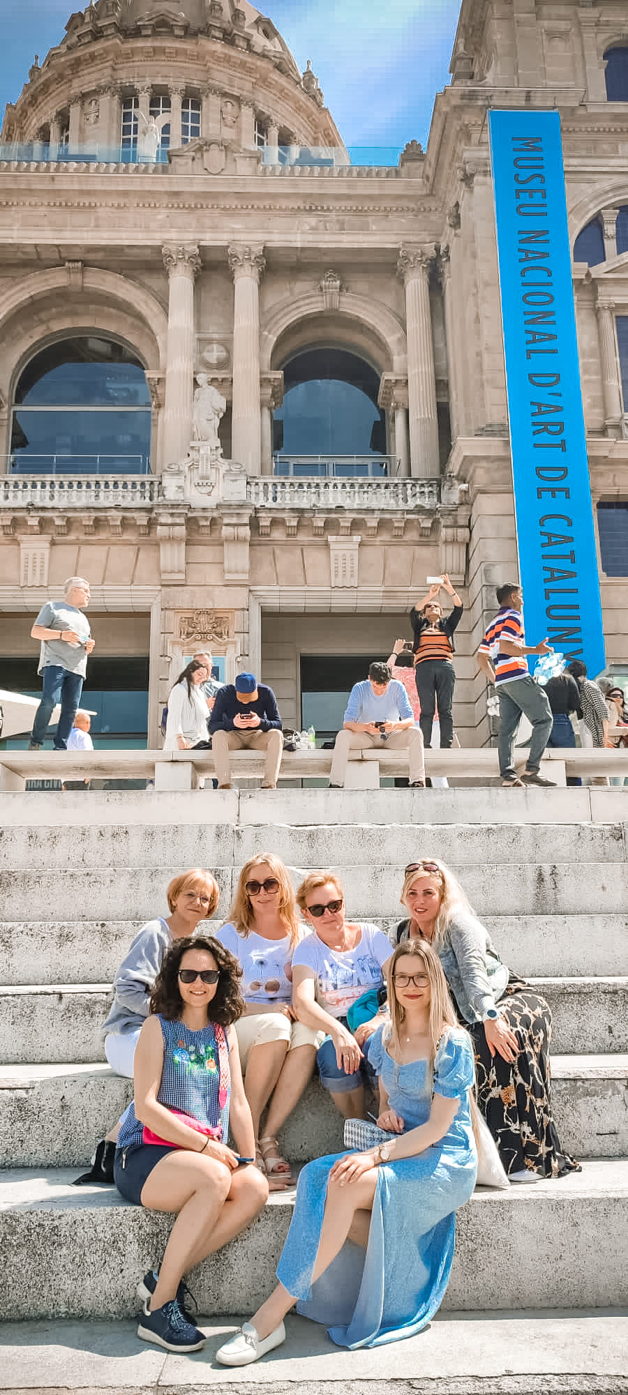 Nauczycielki siedzące na schodach przed budynkiem.